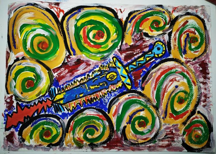 Он остановился возле одной из картин, выполненной в романтично-сиреневых тонах. На изображении была девушка, удобно сидящая валунах. Она, казалось, отдыхала, погруженная в мечтательную задумчивость, глядя в небо. Ах! Если присмотреться, на самом деле, то были вовсе не камни, а огромная голова человека, наполовину погруженная в песок. Хоровод звезд и все вокруг на рисунке было исполнено движения. Только сама девушка, казалось, замерла во времени и пространстве. Лицо ее было залито ярким звездным светом, но Александр заметил тоску и зов в почти неразличимых чертах…